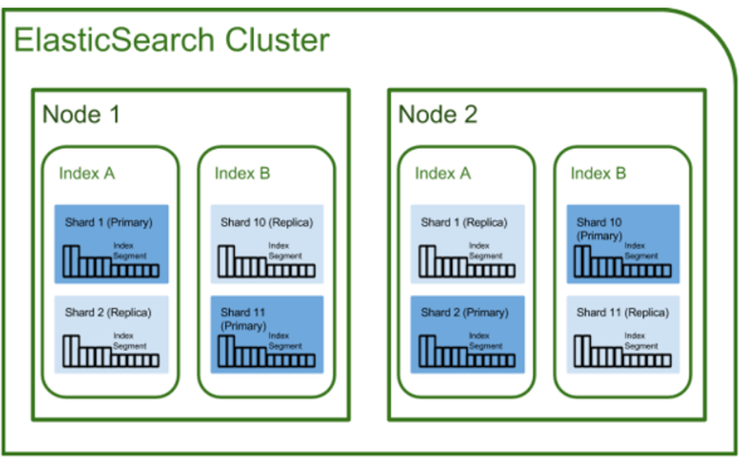 샤드(Shard) : 색인된 데이터를 여러 파티션으로 나누어 저장하는 논리적인 단위이다. 색인이 커질 경우에 검색 성능을 향상시키기 위해 여러 노드에 쉬드를 분산 저장할 수 있다. 샤드는 프라이머리 샤드와 레플리카 샤드로 나뉜다.