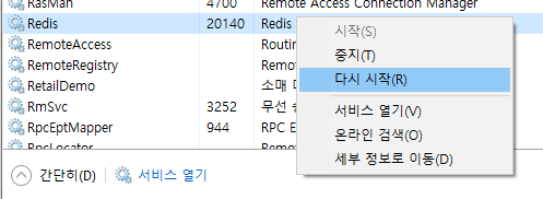 설정을 맞췄으면 작업관리자 -> 서비스 탭에서 레디스 (Redis) 재시작을 하면 자동으로 window-service.conf 파일 설정대로 초기화된다.