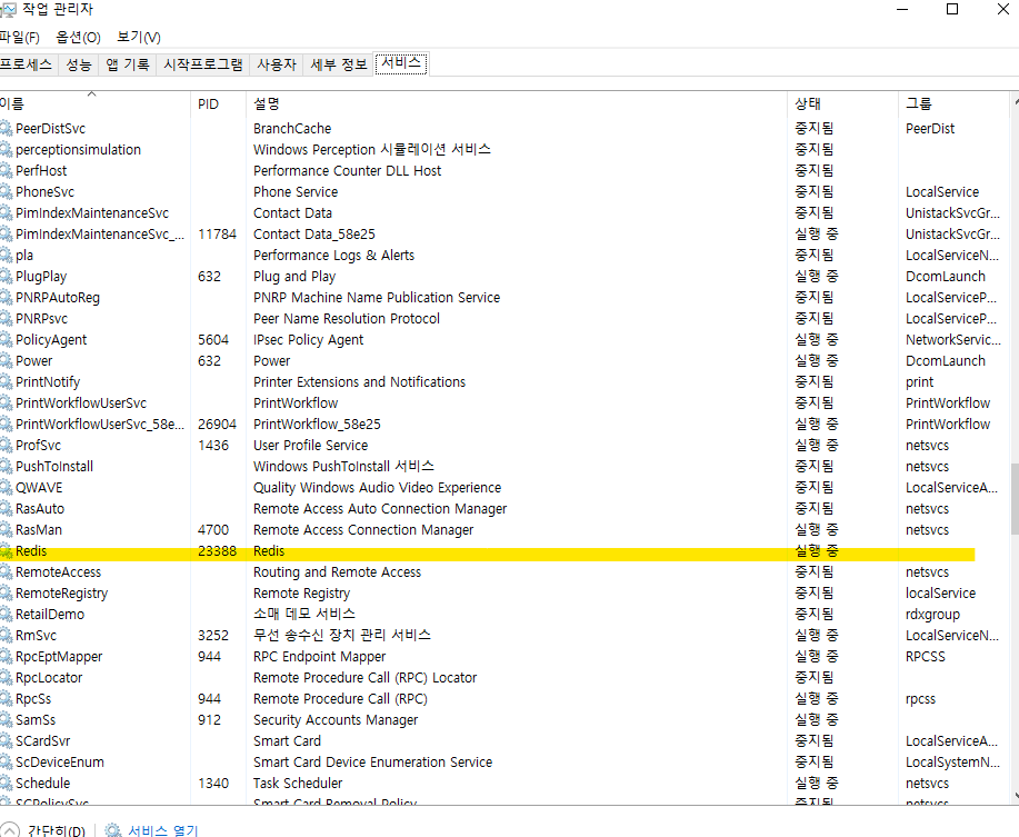 설치가 완료되면 작업관리자 서비스 탭에서 확인이 가능하다. 만일 윈도우 서비스를 사용하지 않는다고 하면 직접 redis-server.exe 파일을 실행해 수동으로 레디스 서버를 실행 시킬 수 있다.
