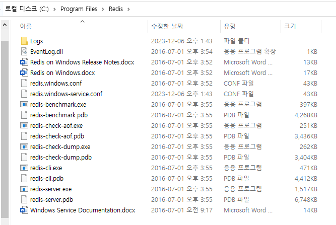파일은 설치경로 C:\Program Files\Redis 에 들어있다.